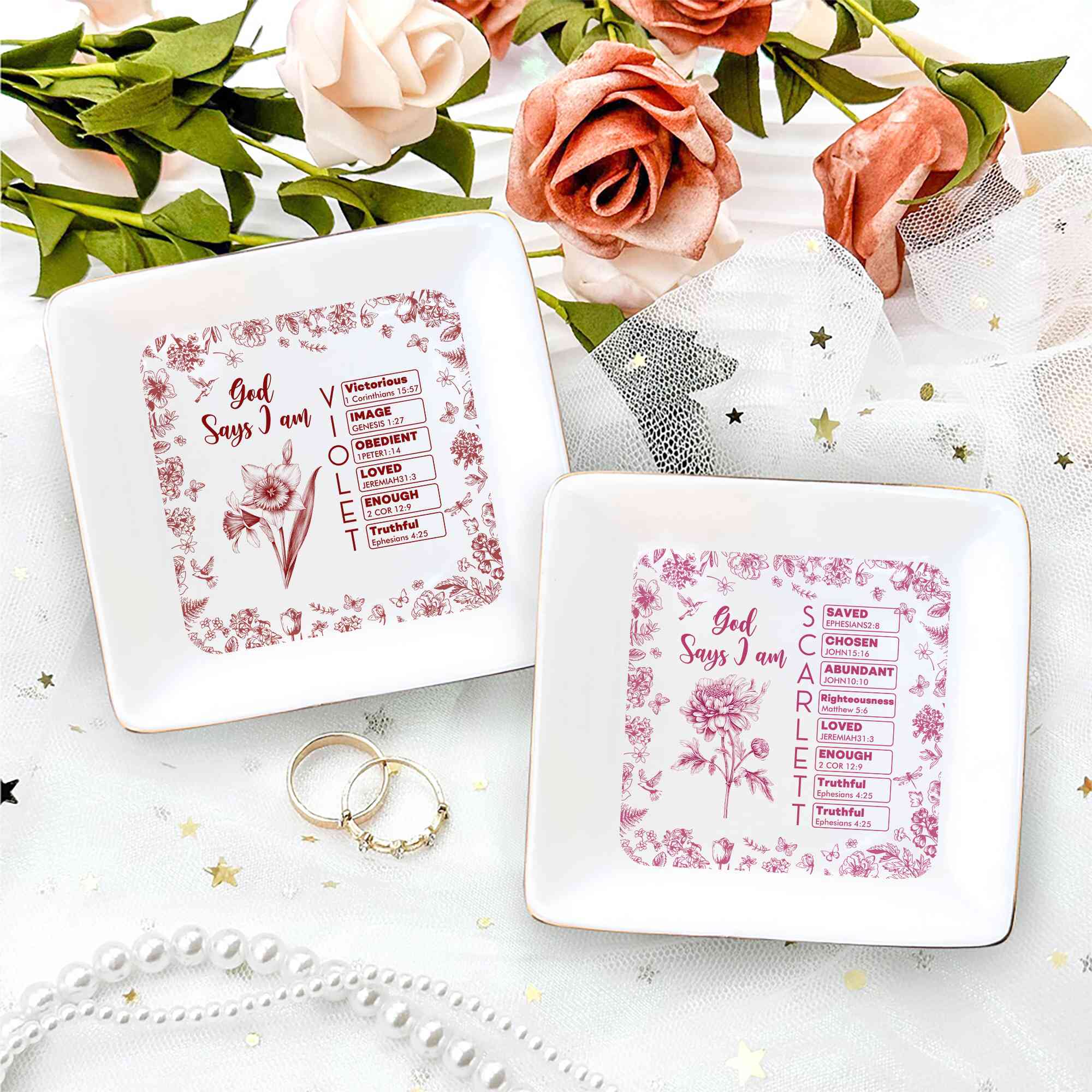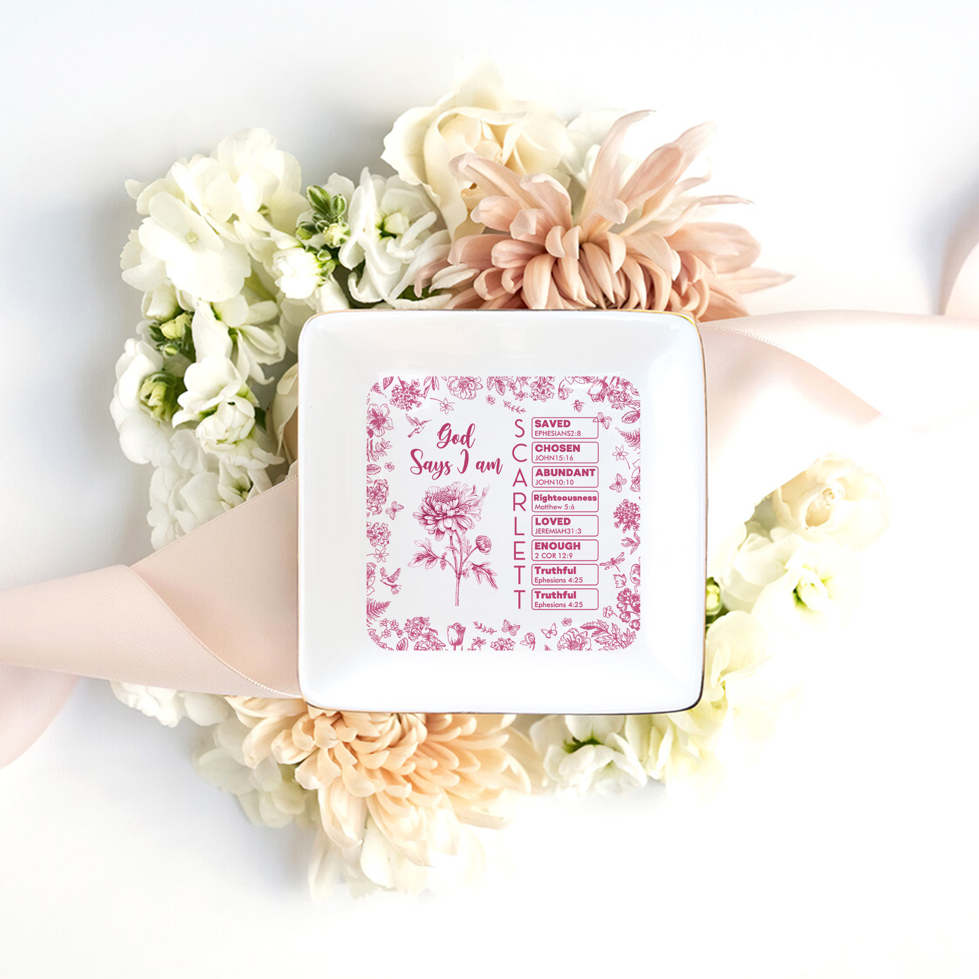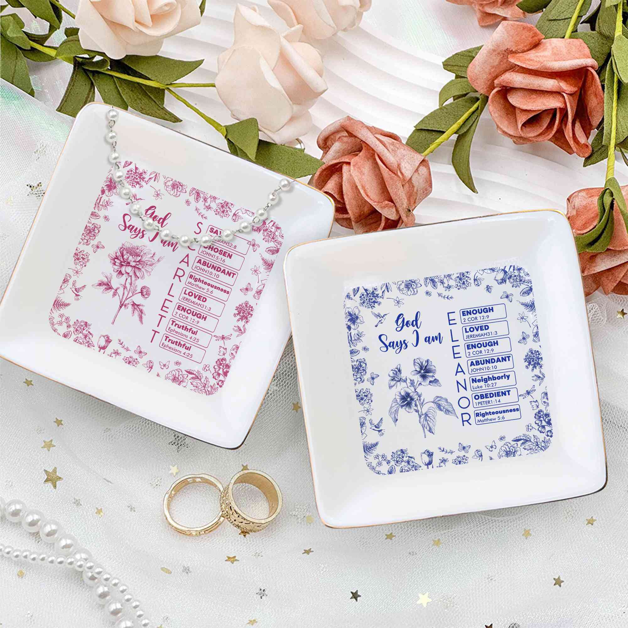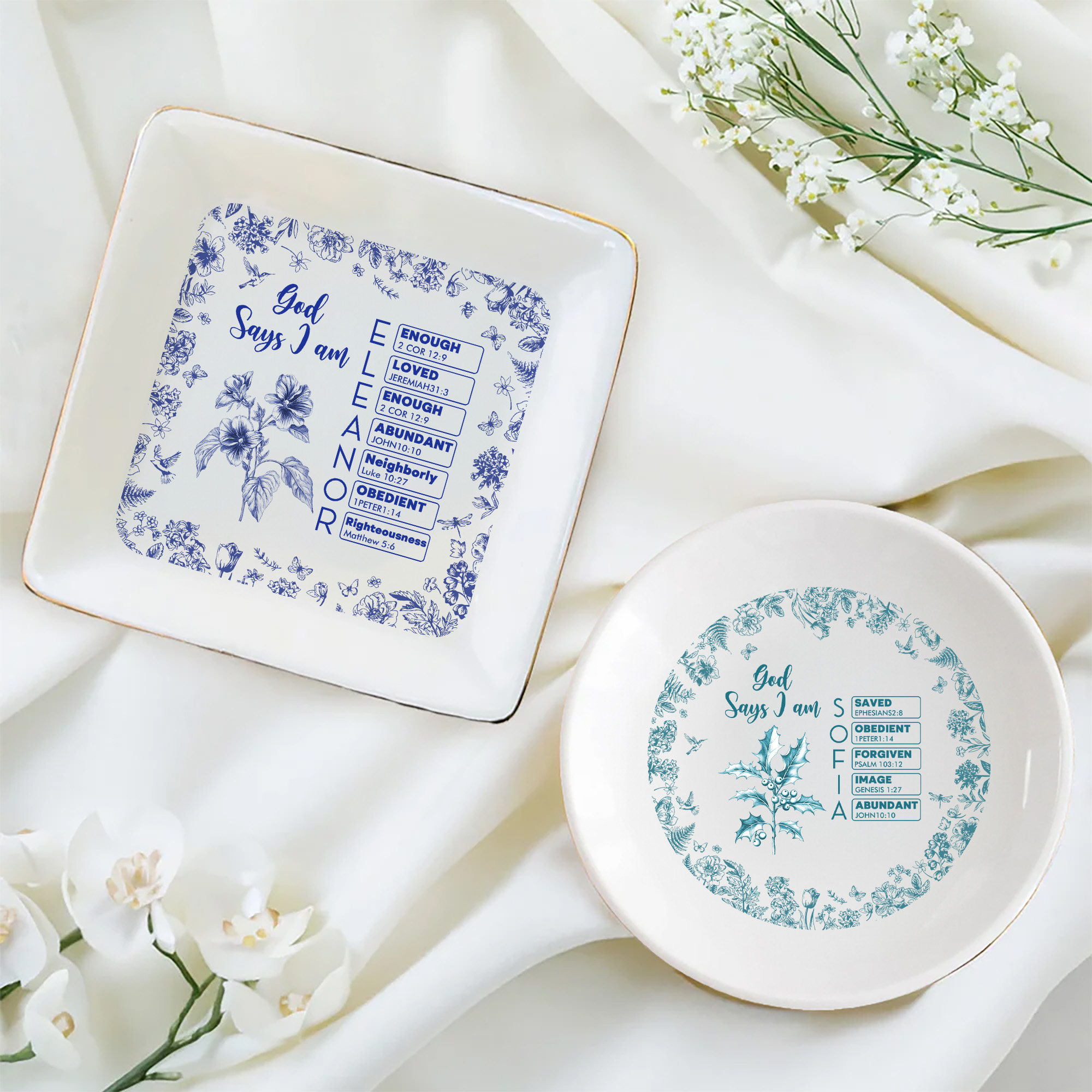 Personalized Name Birth Flower Toile De Jouy God Says I Am Bible Verses Jewelry Dish, Square/Round Ceramic Trinket Tray, Gift for Christian Women